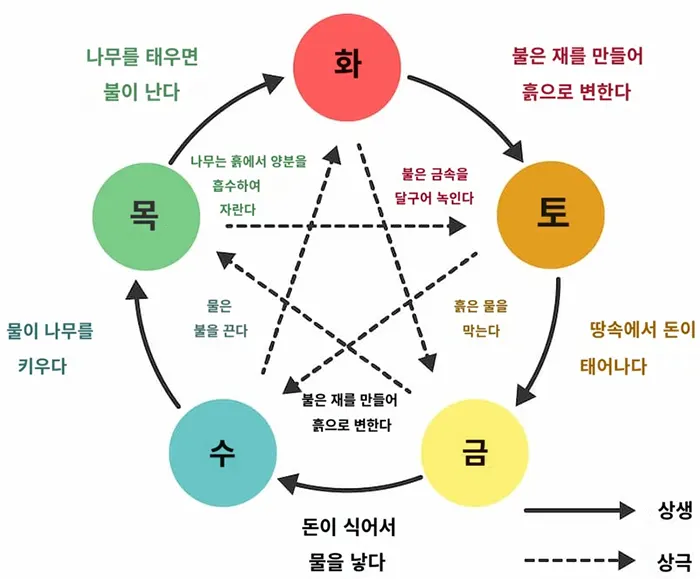 - 금 → 목 : 금으로 만든 도끼로 나무를 베고